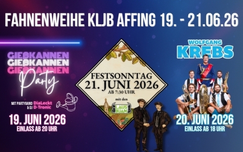 Der Tag beginnt mit der Ankunft der Vereine, gefolgt vom feierlichen Gottesdienst im Festzelt. Am Nachmittag folgen der Festumzug durch Affing und der Fahneneinzug. Den Festausklang genießen wir in der Stadlbar.